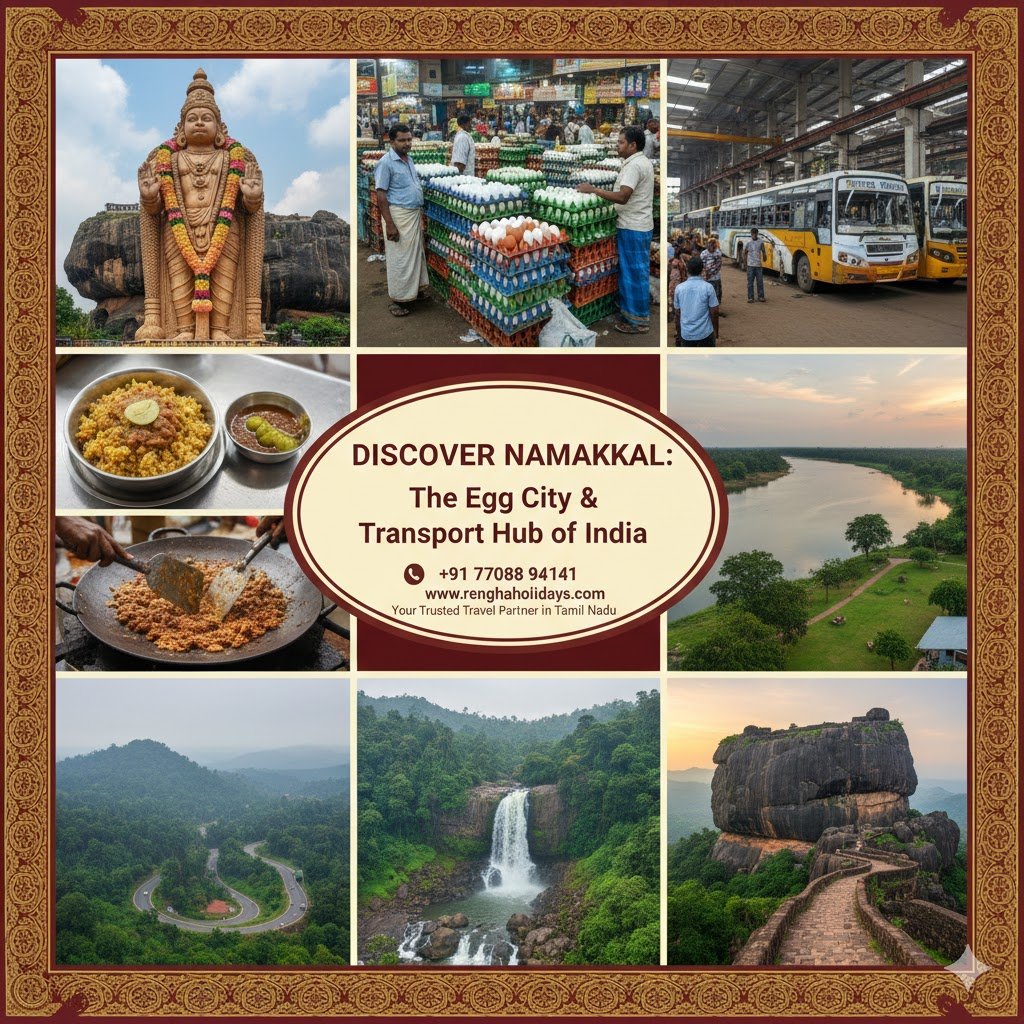 Namakkal, popularly known as the "Egg City" and "Transport City," is a district that epitomizes hard work and industrial success. Located in the Kongu region, it is famous for its massive poultry industry (producing millions of eggs daily), its truck body building workshops, and the majestic Namakkal Anjaneyar Temple. With the colossal single-stone Namakkal Rock Fort dominating its skyline, the city offers a unique blend of industry, geology, and spirituality. This guide explores the vibrant culture, delicious cuisine, administrative structure, and must-visit tourist destinations of the Namakkal district.