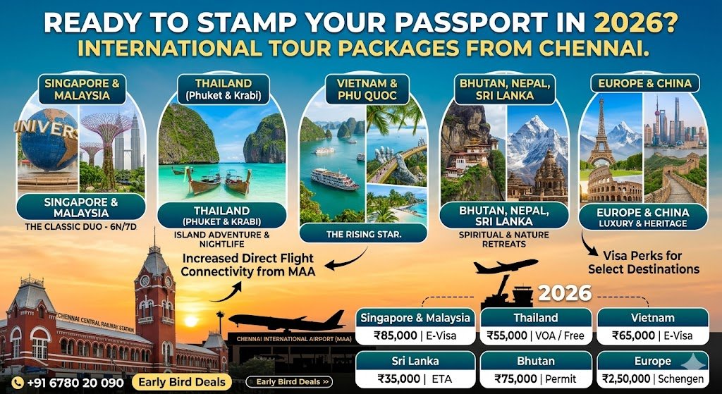 Summary: International Tour Packages from Chennai 2026 In 2026, international travel from Chennai is dominated by Southeast Asian favorites like Singapore, Malaysia, and Vietnam, alongside rising demand for niche island escapes like Phu Quoc and Mauritius. For those seeking cultural depth, Bhutan, Nepal, and Sri Lanka remain top-selling spiritual and nature retreats. Meanwhile, Europe and China continue to be the ultimate bucket-list destinations for luxury and heritage seekers.
