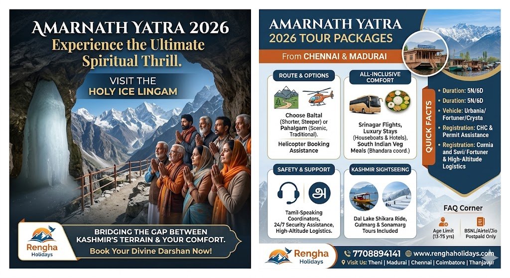 Amarnath Yatra 2026 Tour Packages The 2026 Amarnath Yatra typically commences in late June and concludes in August (Shravan Purnima). Devotees can choose between the Baltal route (shorter but steeper) or the Pahalgam route (traditional and scenic). Our all-inclusive packages from Chennai and Madurai feature flight connectivity to Srinagar, luxury stays, and expert assistance with the mandatory Compulsory Health Certificate (CHC) and Yatra Permits.