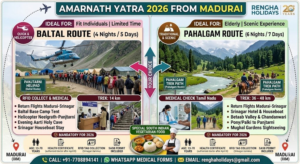Book your Amarnath Yatra from Madurai with Rengha Holidays. 2026 packages include flights, Helicopter tickets, Yatra permits, and South Indian food. 100% registration support. Call 77088 94141 today!