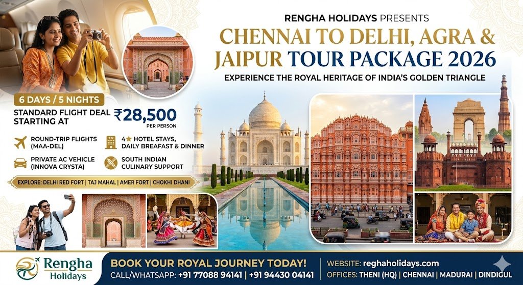 Book the ultimate Golden Triangle tour from Chennai with Rengha Holidays. 6-day 2026 packages include flights, Taj Mahal visit, Jaipur forts, and South Indian food. Call 77088 94141 today!