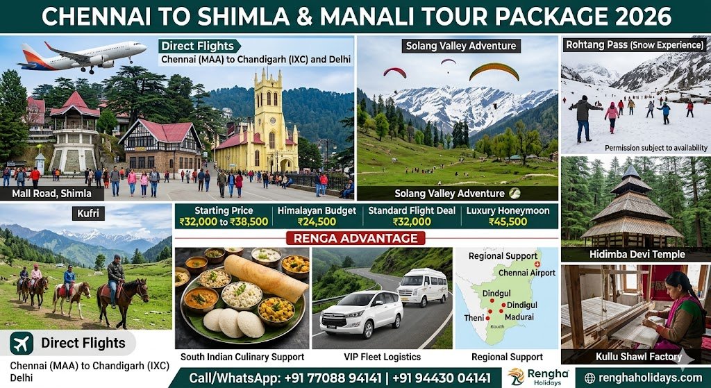 Book the ultimate Shimla Manali tour from Chennai with Rengha Holidays. 6-day 2026 packages include flights, Solang Valley snow tours, 4★ resorts, and South Indian food. Call 77088 94141 today!