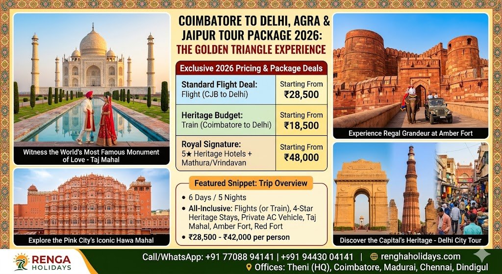 Book the ultimate Golden Triangle tour from Coimbatore with Rengha Holidays. 6-day 2026 packages include flights, Taj Mahal, Amber Fort, and Delhi City Tour. Call 77088 94141 today!