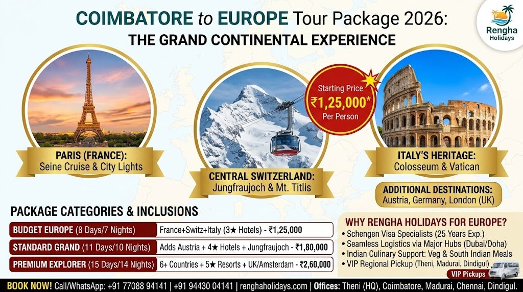 Book the best Europe tour from Coimbatore with Rengha Holidays. 2026 packages include flights, Paris, Switzerland, Italy, and Schengen Visa assistance. Call 77088 94141 today!