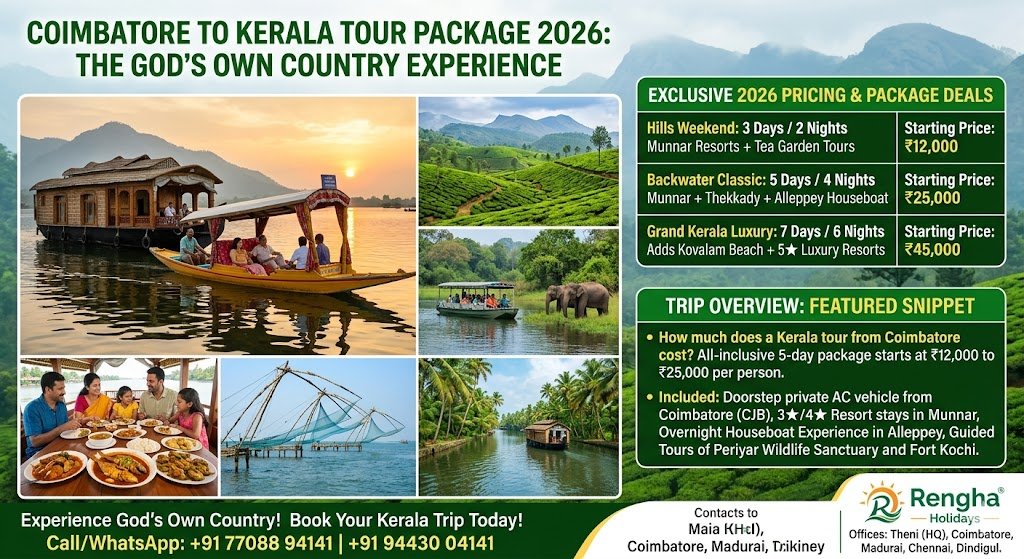 Book the best Kerala tour from Coimbatore with Rengha Holidays. 5-day 2026 packages include Munnar Tea Gardens, Alleppey Houseboats, and Fort Kochi. Call 77088 94141 today!