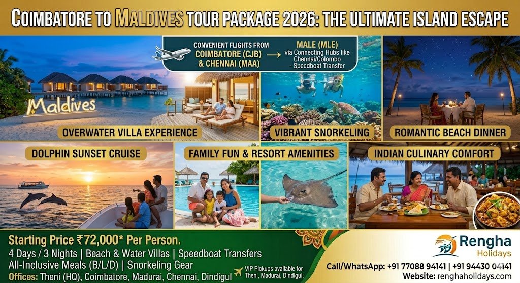 Book the best Maldives tour from Coimbatore with Rengha Holidays. 4-day 2026 packages include flights, Water Villas, transfers, and All-inclusive meals. Call 77088 94141 today!