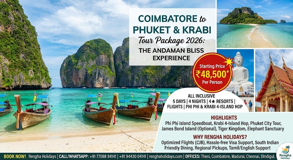 Book the best Phuket & Krabi tour from Coimbatore with Rengha Holidays. 5-day 2026 packages include flights, Phi Phi Island, 4-star resorts, and Visa assistance. Call 77088 94141 today!