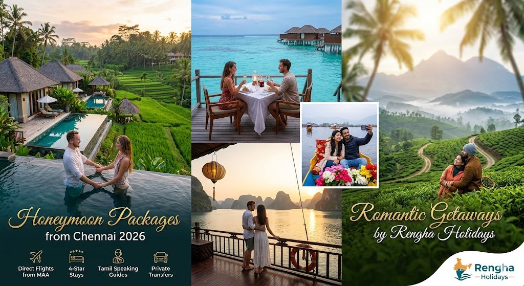 Rengha Holidays offers the best honeymoon packages from Chennai for 2026, featuring top-rated romantic destinations like Bali, Maldives, Vietnam, and Munnar. Our all-inclusive 2026 tour packages from Chennai include 4-star accommodations, private transfers, and customized romantic experiences. Whether you seek a budget-friendly international trip or a luxury domestic escape, Rengha Holidays provides expert guidance and seamless travel planning for couples in Tamil Nadu.