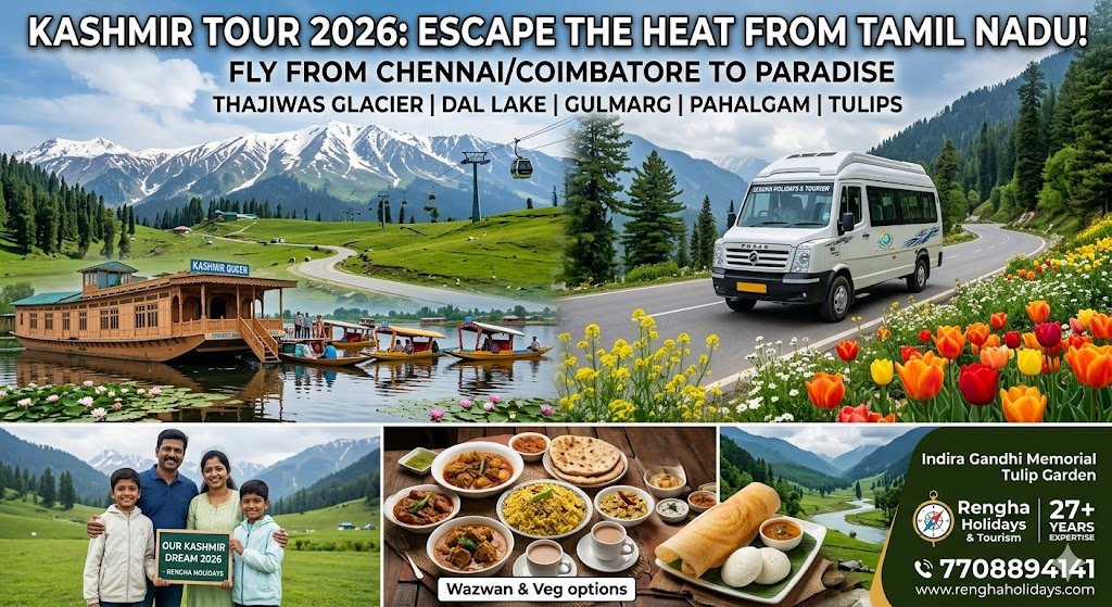 Planning a trip to Kashmir from Tamil Nadu in 2026? This guide covers everything from flight connectivity via Chennai/Coimbatore to the best summer spots like the Thajiwas Glacier and Dal Lake. Discover why Rengha Holidays is the top choice for Tamil travelers, offering luxury Force Urbania transport, curated Wazwan (and Veg) food guides, and all-inclusive itineraries for families and honeymooners.