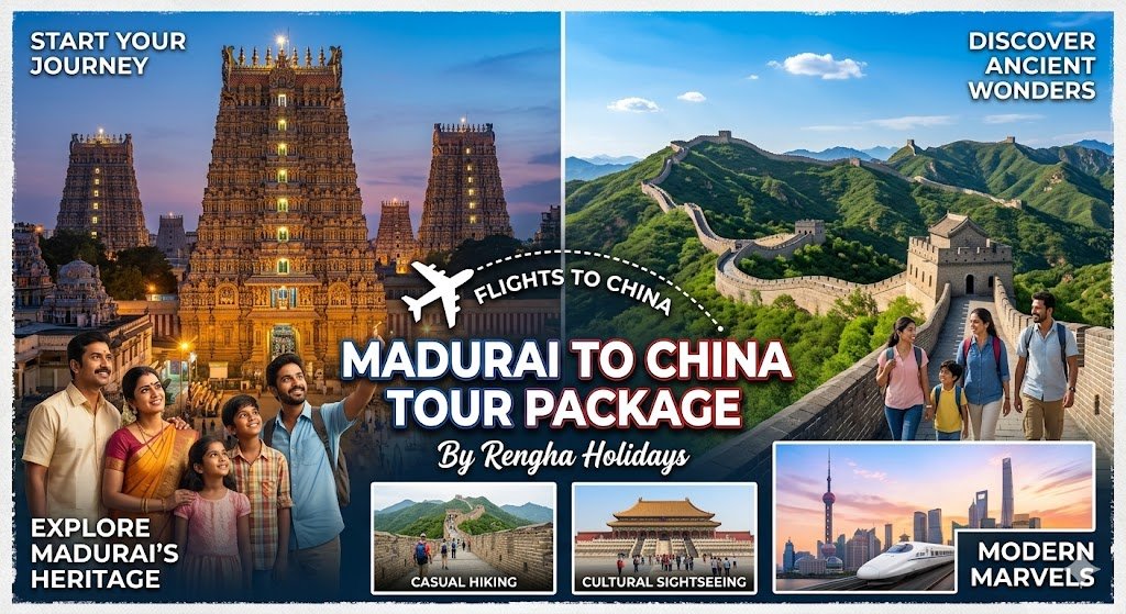 Book the ultimate China tour from Madurai with Rengha Holidays. 8-day 2026 packages include flights, Great Wall tours, 4★ hotels, and Visa assistance. Explore Beijing & Shanghai. Call 77088 94141 today!