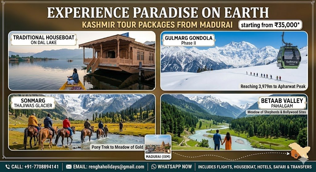 Book the ultimate Kashmir tour from Madurai with Rengha Holidays. 6-day 2026 packages include flights, Houseboat stays, Gulmarg Gondola, and South Indian food. Call 77088 94141 today!