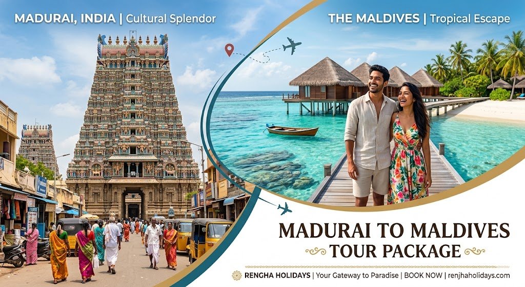 Book the ultimate Maldives tour from Madurai with Rengha Holidays. All-inclusive 2026 packages include flights, water villa stays, speedboat transfers, and South Indian food. Free visa-on-arrival support. Call 77088 94141 today!