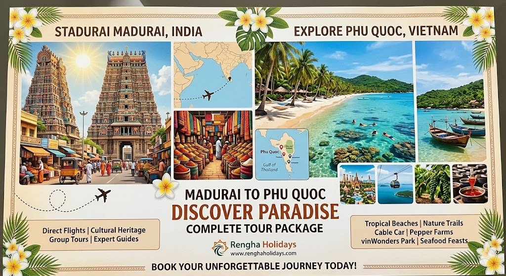 For travelers from South Tamil Nadu, the Madurai to Phu Quoc Tour Package by Rengha Holidays offers a unique "visa-free" island escape. Phu Quoc is Vietnam’s "Pearl Island," known for its white sands, world-record cable cars, and massive theme parks.