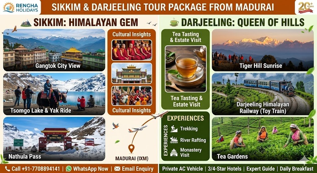 Book the best Sikkim Darjeeling tour from Madurai with Rengha Holidays. 6-day 2026 packages include flights, Tiger Hill sunrise, 4★ hotels, and permit assistance. Perfect for families. Call 77088 94141!