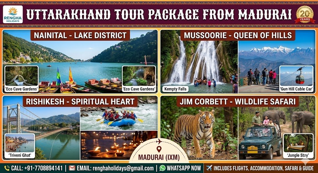 : Book the best Uttarakhand tour from Madurai with Rengha Holidays. 7-day 2026 packages include flights, Mussoorie & Rishikesh tours, 4★ hotels, and South Indian food. Perfect for families. Call 77088 94141!