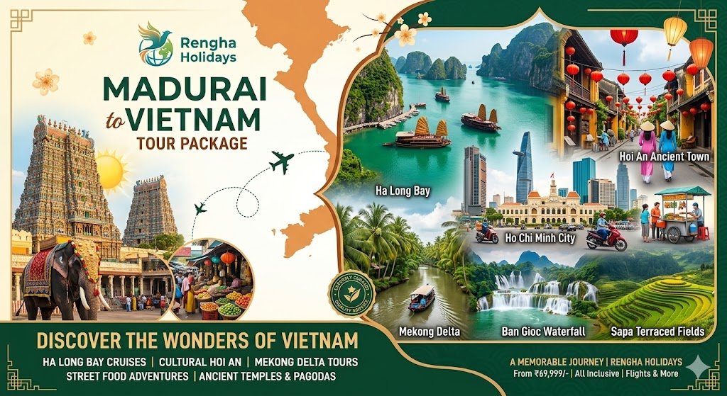 Book your Vietnam tour from Madurai with Rengha Holidays. All-inclusive 2026 packages include flights, Halong Bay cruises, 4★ hotels, and visa assistance. Discover Hanoi, Hoi An, and Saigon. Call 77088 94141 today!