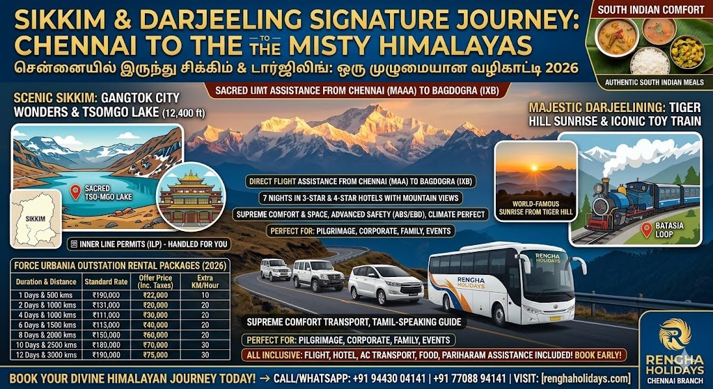 Escape to the misty heights of the Himalayas with Rengha Holidays' exclusive 8-Day Sikkim & Darjeeling Signature Journey, tailored specifically for travelers from Chennai. We specialize in bridging the gap between South India and the Northeast, ensuring you feel at home even at 12,000 feet.